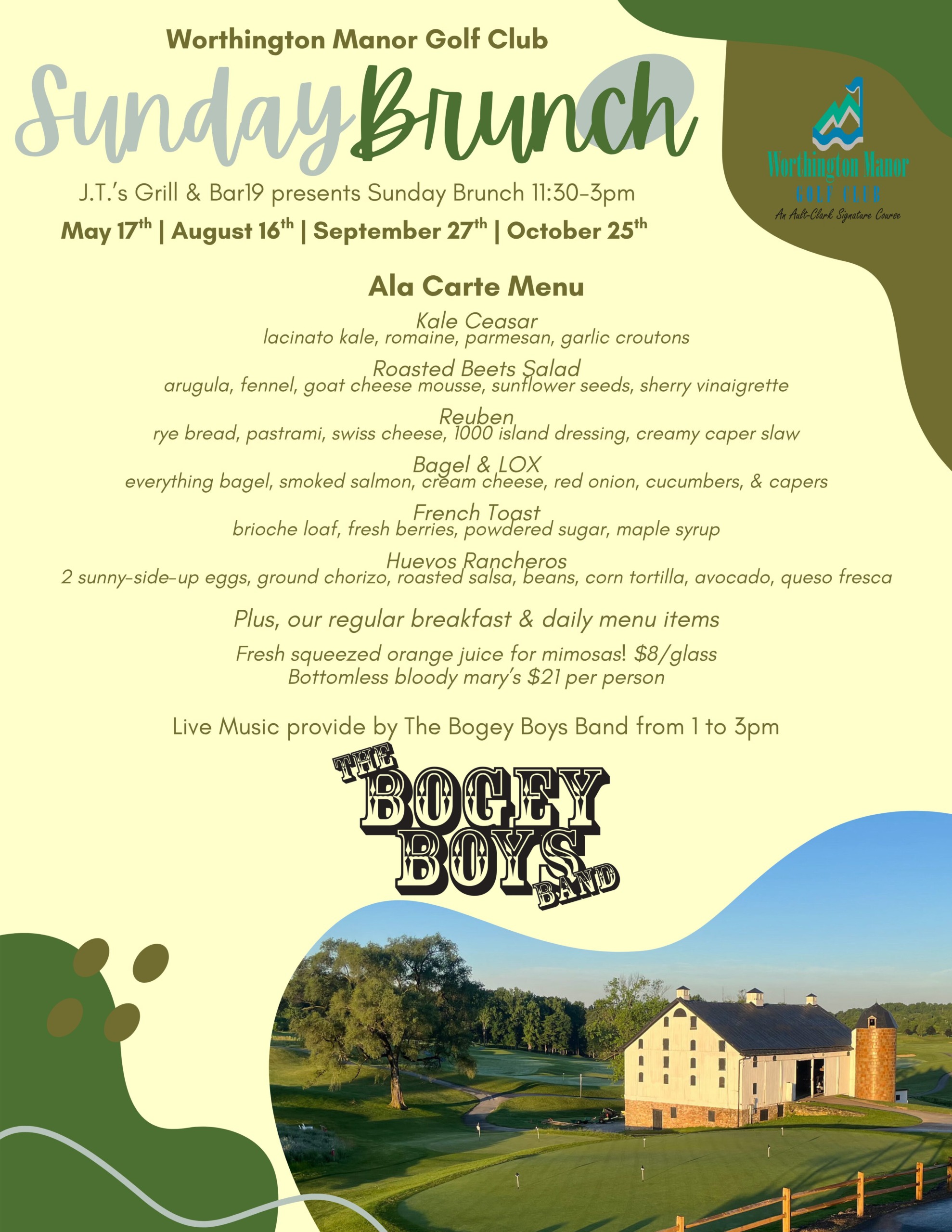 Tee up your weekend Friday evening with intimate live music. Our covered patio offers a unique and spectacular view of our golf course, 19th century bank barn and stunning sunsets.